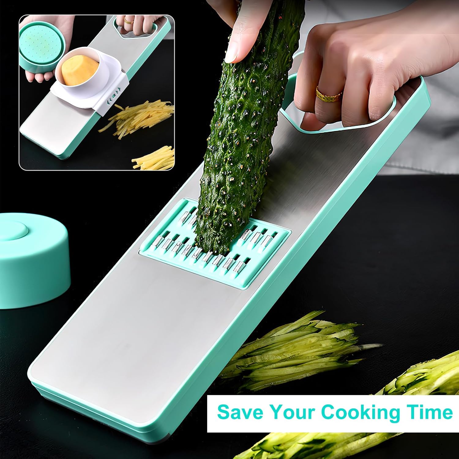 8-in-1 vegetable grater + 2-in-1 melon peeler: This high-quality cucumber slicer made of stainless steel is a practical kitchen tool that contains 6 different knives and 1 improved hand protection. The small storage box can store 4 knives, and 2 frequently used knives can be stored on the back of the cutting device. Compared to other vegetable cutters, we are equipped with a 2-in-1 melon peeler, which can both peel and grate.